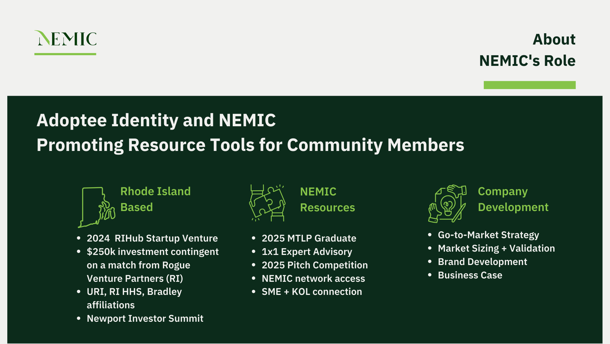 For Rhode Island’s innovation landscape, Adoptee Identity represents the kind of compassionate, community-anchored entrepreneurship that NEMIC is proud to spotlight.
