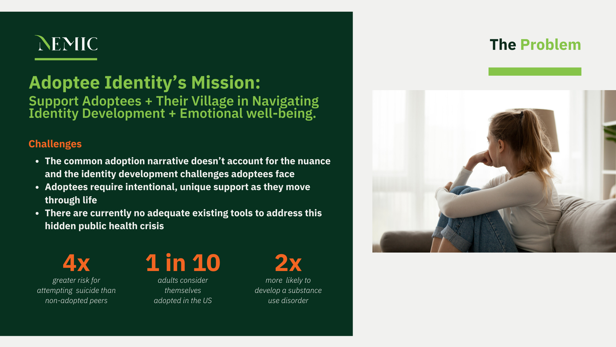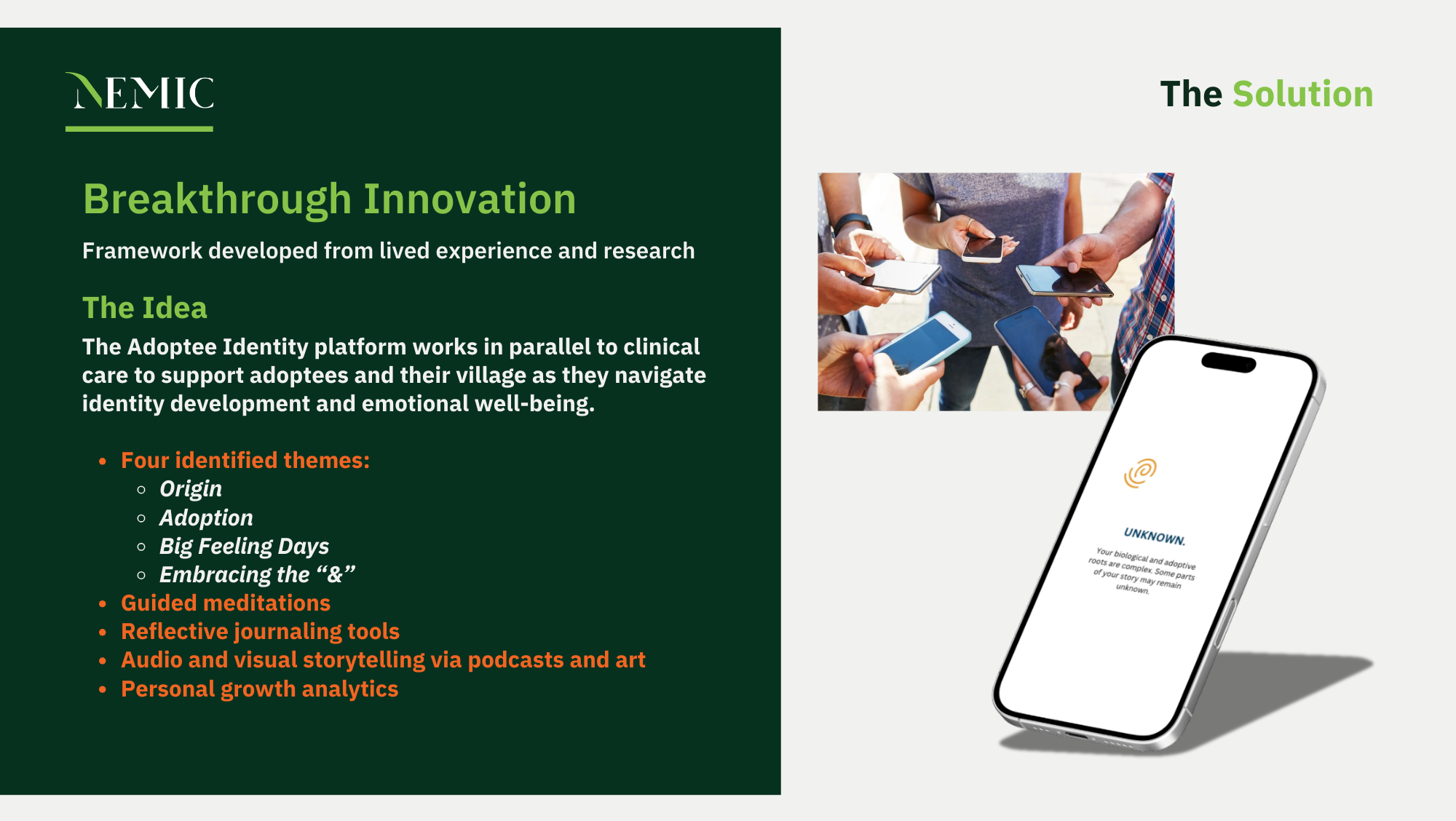 With guidance and business advisory from NEMIC, Adoptee Identity continues to develop its B2B and B2C target markets, as well as build out the business model and app development. The platform offers a compelling opportunity for why employers, universities, & providers will be incentivized to engage, by providing a benefit that strengthens mental well-being, belonging, and organizational performance.